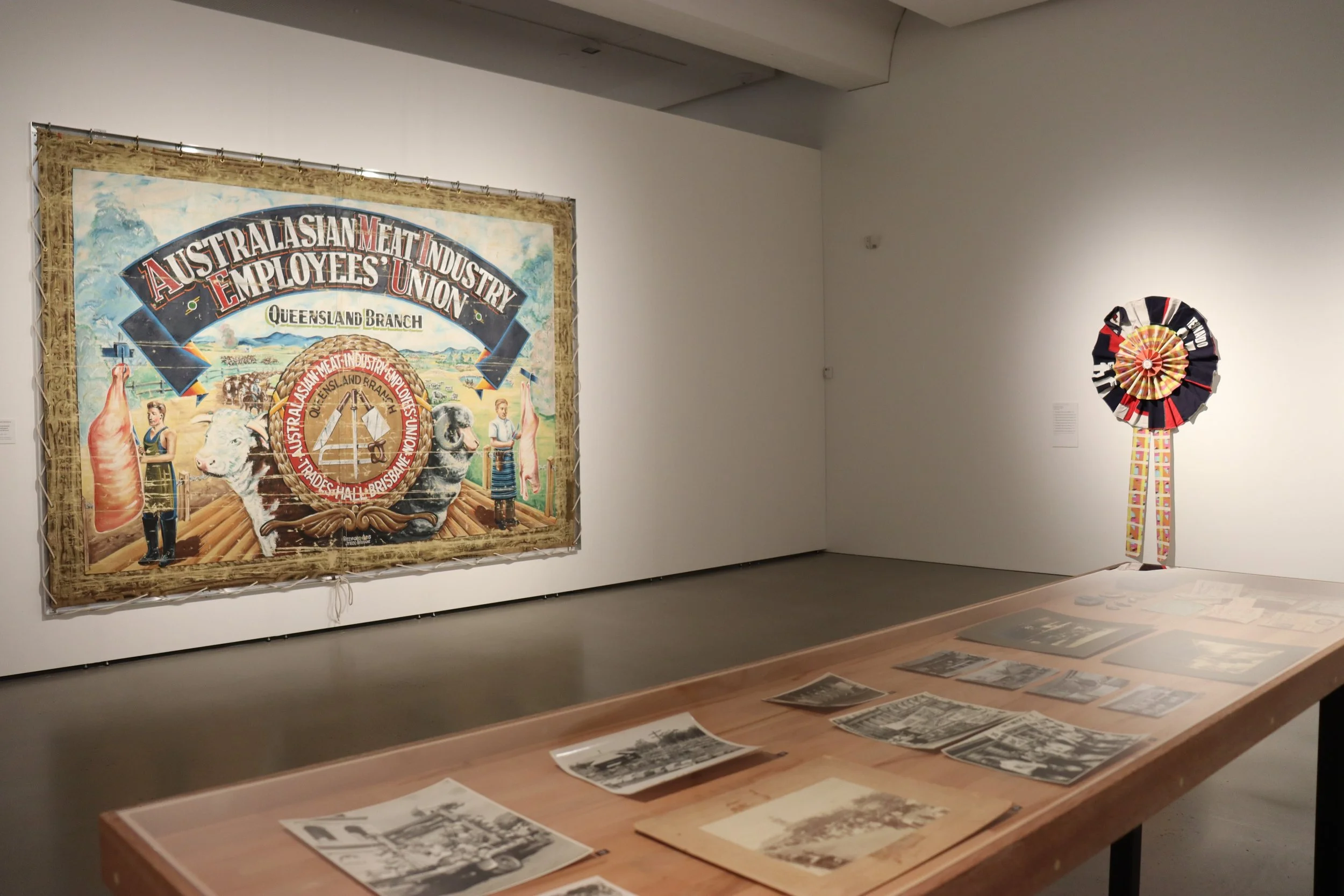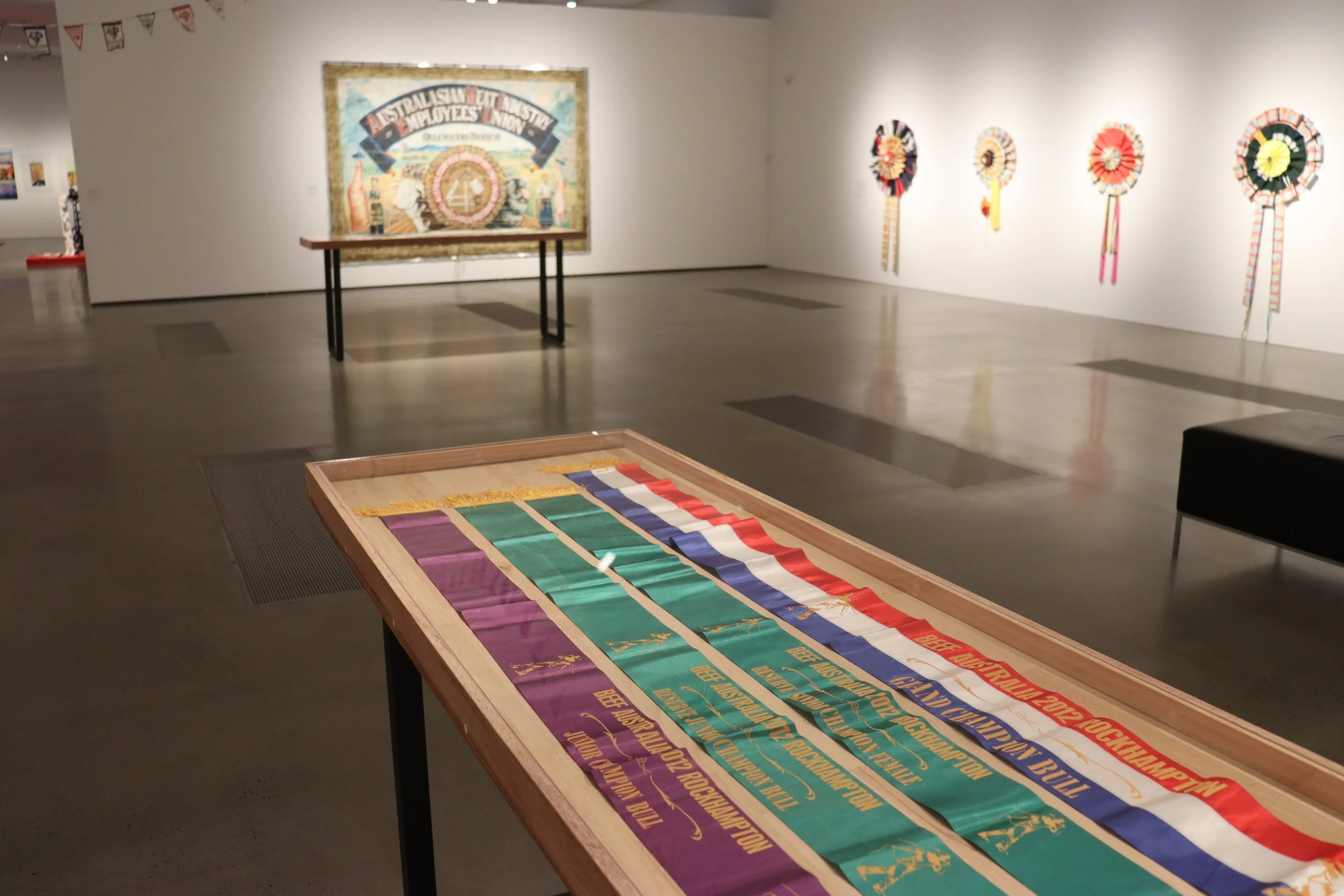 Capricornian Minotaurs and Where To Find Them is a deep dive into the archives that hold the social history of beef. Selected archival photographs, prize ribbons, badges, union banners, and bunting, are sourced from Central Queensland family collections, cattle breeders’ societies, labour unions, and public libraries nationally. Included in the exhibition is the rarely seen 20th century union rally banner from the Queensland Branch of the Australasian Meat Industry Employees Union. An incredible artwork and historical object in its own right, that carries many stories.